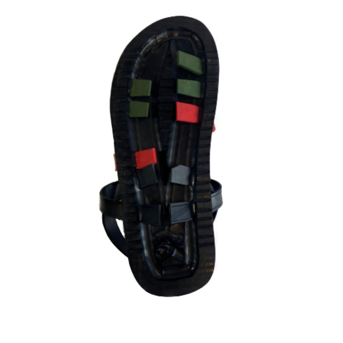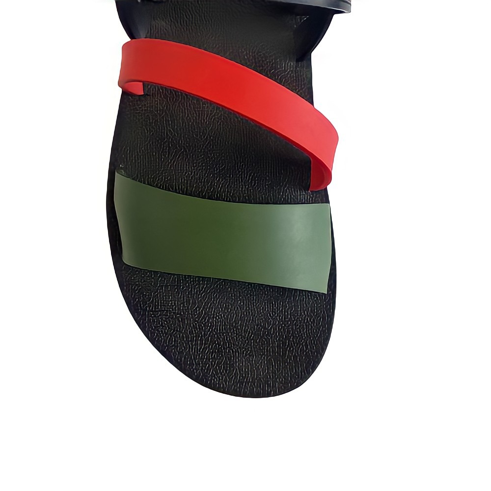 The design features three colored front straps in black, red, and green paired with a supportive black heel strap and classic black sole. This balanced strap layout offers a secure fit and modern handcrafted style, making the sandals comfortable for everyday wear, travel, and outdoor lifestyles.