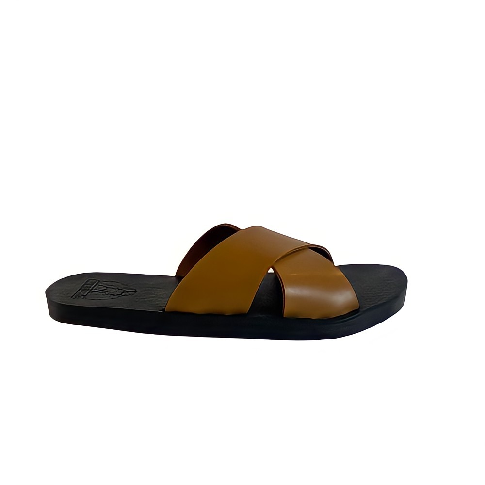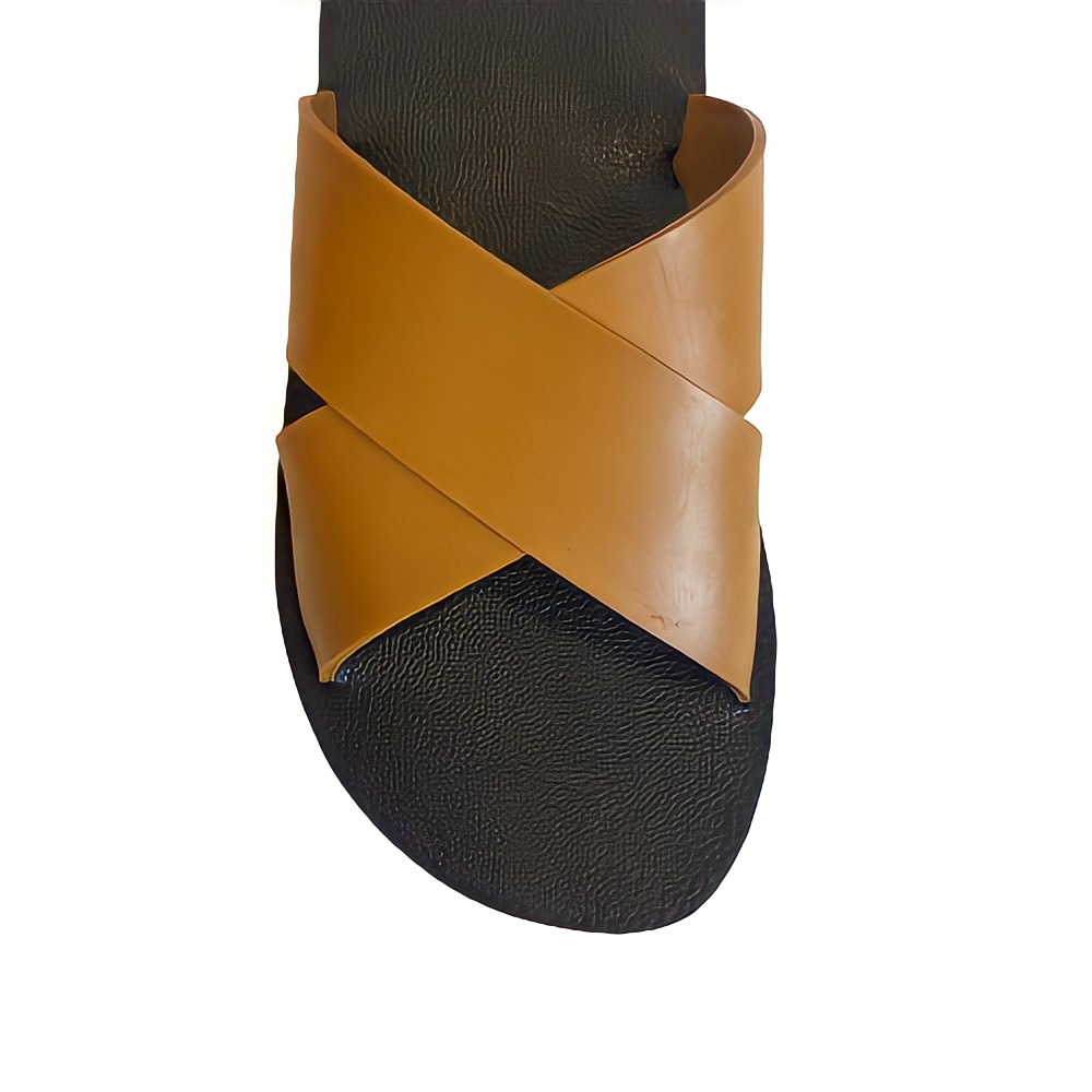 The wide tan cross-strap upper sits over a rugged black tire sole, creating a strong and stylish look while providing a secure and comfortable fit. Lightweight yet extremely durable, these sandals are perfect for everyday wear, travel, and outdoor activities.